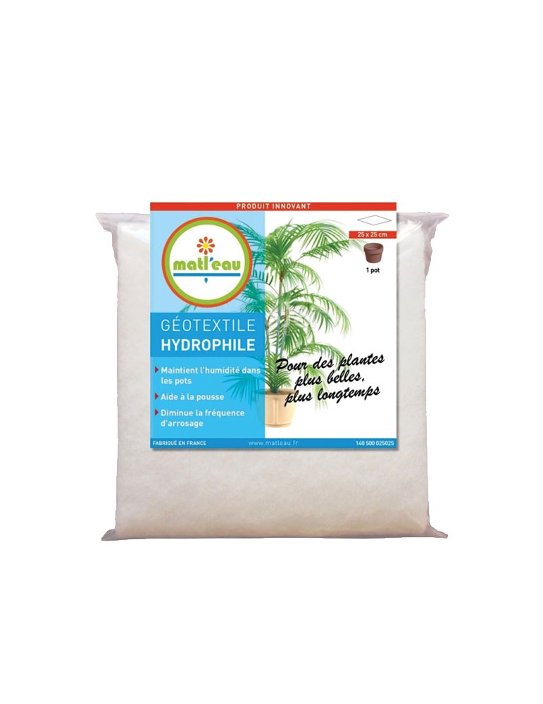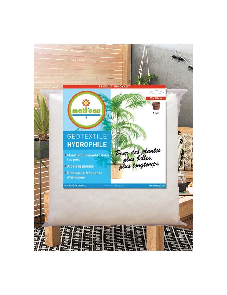 Utilisé dans des pots en intérieur ou en extérieur, le géotextile hydrophile permet une économie d’eau de 15 à 20 %, garantissant une humidité prolongée en cas d’absence.